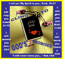 "Because of Christ and our faith in Him, we can now come fearlessly into God's presence, assured of His glad welcome." Ephesians 3:12 [NLT] BELIEF " I have come into the world as light, so that no one who believes in me should stay in darkness." John 12:46 " Yet to all who received him, to those who believed in his name, He gave the right to become children of God." John 1:12 CHARITY " Give, and it will be given to you. A good measure, pressed down, shaken together and running over, will be poured into your lap." Luke 6:38 " A generous man will himself be blessed, for he shares his food with the poor." Proverbs 22:9 COMFORT " God is our refuge and strength, an ever present help in trouble." Psalm 46:1 " I have told you these things, so that in me you may have peace. In this world you will have trouble. But take heart ! I have overcome the world ! " John 16:33 " Come to me, all you who are weary and burdened, and I will give you rest." Matt. 11:28 COURAGE " He gives strength to the weary and increases the power of the weak " Isaiah 40:29 " Fear not, for I have redeemed you; I have summoned you by name; you are mine" Isaiah 43:1 ETERNAL LIFE " I tell you the truth, he who believes has everlasting life." John 6:47 " And this is what he promises us--even eternal life ." 1 John 2:25 " Jesus said: 'I am the resurrection and the life. He who believes in me will live, even though he dies'....." John 11:25 "My sheep listen to my voice; I know them and they follow me. I give them eternal life, and they shall never perish; no one can snatch them out of my hand." John 10:27.28 FAITH "Now faith is being sure of what we hope for and certain of what we do not see" Heb.11:1 "You are all sons of God through faith in Christ Jesus" Gal. 3:26 "We live by faith, not by sight" 2 Cor. 5:7 FAITHFULNESS "Know therefore that the Lord your God is God; he is the faithful God, keeping his covenant of love to a thousand generations of those who love him and keep his commands." Deut.7:9 "Though the mountains be shaken and the hills be moved, yet my unfailing love for you will not be shaken nor my covenant of peace be removed." Isaiah 54:10 GUIDANCE " I will instruct you and teach you in the way you should go; I will counsel you and watch over you." Psalm 32:8 " I will lead the blind by ways they have not known, along unfamiliar paths I will guide them, I will turn the darkness into light before them and make the rough places smooth. These are the things I will do; I will not forsake them." Isaiah 42:16 JOY " I have told you this so that my joy may be in you and your joy maybe complete" John 15:11 "...but I will see you again and you will rejoice, and no one will take away your joy." John 16:22 LONG LIFE " Even to your old age and gray hairs I am he, I am he who will sustain you. I have made you and I will carry you; I will sustain you and I will rescue you. " Isaiah 46:4 " For through me your days will be many, and years will be added to your life." Proverbs 9:11 LOVE " I have loved you with an everlasting love; I have drawn you with loving-kindness." Jeremiah 31:3 " I love those who love me, and those who seek me find me." Proverbs 8:17 "No eye has seen, no ear has heard, no mind has conceived what God has prepared for those who love him." 1 Cor. 2:9 MERCY "...the Lord longs to be gracious to you; he rises to show you compassion. For the Lord is a God of justice. Blessed are all who wait for him! " Isaiah 30:18 " As a father has compassion on his children, so the Lord has compassion on those who fear him." Psalm 103:13 PEACE " Peace I leave with you, my peace I give you. I do not give as the world gives. Do not let your hearts be troubled and do not be afraid." John 14:27 " And the peace of God, which transcends all understanding, will guard your hearts and your minds in Christ Jesus." Phil. 4:7 PRAYER " Then you will call upon me and come and pray to me, and I will listen to you." Jeremiah 29:12 "Before they call I will answer; while they are still speaking I will hear." Isaiah 65:24 " This is the assurance we have in approaching God; that if we ask anything according to his will, he hears us." 1 John 5:14 PROTECTION "The Lord will keep you from all harm--he will watch over your life; the Lord will watch over your coming and going both now and forevermore." Psalm 121:7, 8 " When you pass through the waters, I will be with you; and when you pass through the rivers, they will not sweep over you. When you walk through the fire, you will not be burned; the flames willnot set you ablaze." Isaiah 43:1,2 "But whoever listens to me will live in safety and be at ease, without fear of harm" Proverbs 1:33 SALVATION " But when the kindness and love of God our Saviour appeared, he saved us, not because of righteous things we had done, but because of his mercy. He saved us through the washing of rebirth and renewal by the Holy Spirit, whom he poured out on us generously through Jesus Christ our Saviour. " Titus 3:4-6 "Therefore, if anyone is in Christ, he is a new creation; the old has gone, the new has come!" 2 Cor 5:17 SUCCESS " That everyone may eat and drink, and find satisfaction in all his toil--this is the gift of God." Ecc 3:13 "Moreover, when God gives any man wealth and possessions, and enables him to enjoy them, to accept his lot and be happy with his work---this is a gift of God." Ecc 5:19 " With me are riches and honor, enduring wealth and prosperity. My fruit is better than fine gold; what I yield surpasses choice silver." Proverbs 8: 18,19 TRUST " Trust in the Lord with all your heart and lean not on your own understanding; in all your ways acknowledge him, and he will make your paths straight." Proverbs 3: 5,6 "Blessed is the man who makes the Lord his trust...." Psalm 40:4 WISDOM "For the Lord gives wisdom, and from his mouth come knowledge and understanding." Proverbs 2:5 ".....He will teach us his ways, so that we may walk in his paths...." Isaiah 2:3 WORD OF GOD " Fix these words of mine in your hearts and min